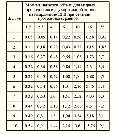 טבלה 3. רגע העומס, קילוואט x מ ', למוליכי נחושת בקו דו חוטי במתח של 12 וולט לקטע נתון של המוליך